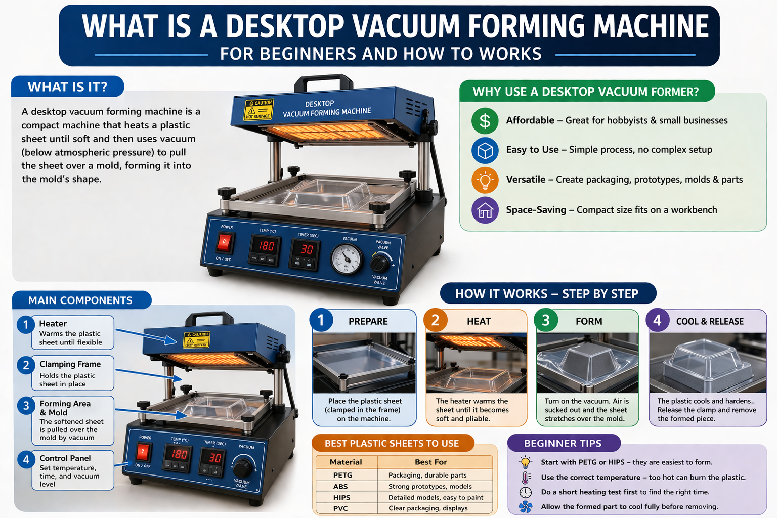A desktop vacuum forming machine for beginners heats plastic sheets and forms them over a mold using vacuum pressure.